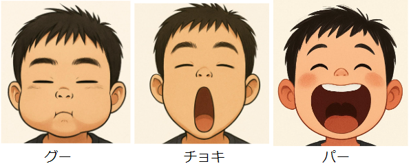 顔の表情で「グー」「チョキ」「パー」を表現しじゃんけんします。