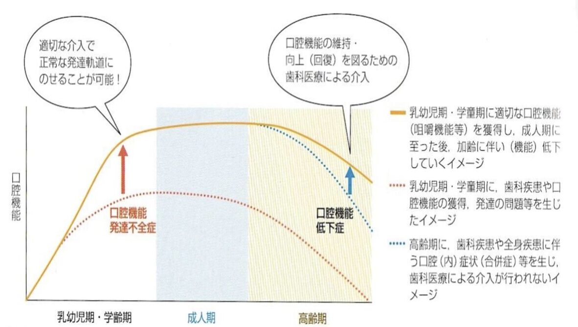 口腔機能は、ほかの身体機能と同じように、子供の頃に獲得し、成人期にはその機能を維持し、高齢になると機能は低下していきます。